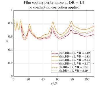 Figure 2: Preliminary adiabatic effectiveness results of strut from low speed, low temperature testing at UT. Note – these results have not yet been corrected for conduction and so are unrealistically high.