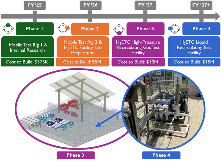 Figure 1: A phased approach allows for incremental expansion of scope, experience, and funding of the H2ETC facility. Inset pictures show a 3D rending of Phase 3 of the H2ETC High-Pressure Recirculating Gas Test Facility, as well as a picture of SwRI’s current liquid hydrogen pump system, which is a representation of the type of equipment included in the Phase 4 facility.