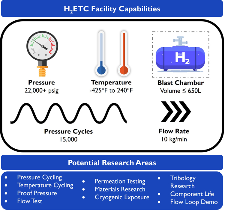 Figure 3: The H2ETC facility will cover a wide range of test capabilities for high-pressure hydrogen gas and cryogenic liquid hydrogen. These capabilities were designed from surveying the industry testing needs and the current state-of-the-art. The H2ETC facility will aid in various research areas such as pressure cycling, permeation testing, and endurance testing of hydrogen components and systems.