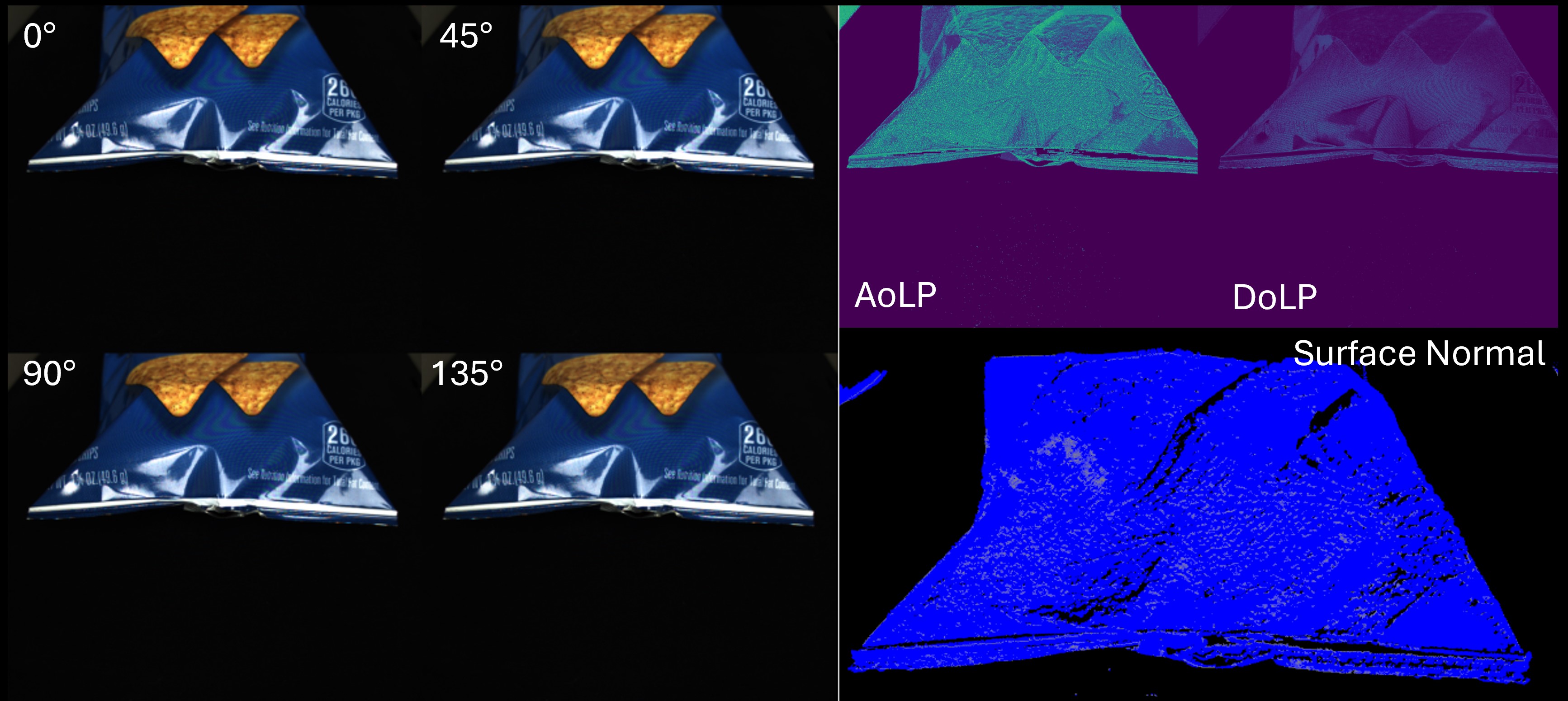 The goal was to detect package defects using split-pixel polarization features to enhance detection accuracy to improve the quality control in the production process. The team evaluated images of various types of defects that included tears and openings captured via the micro-polarizing imager. The team developed a software package to capture data, to analyze the polarization features, and to evaluate the detection performance. The detection system achieved greater than 96% accuracy for detecting polarized images with defective seals. In addition, the system can generate a geometric surface profile to provide richer data while minimizing reflections from the packaging material.