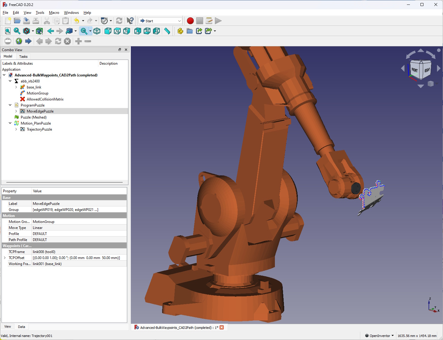 We developed this tool as a modular plug-in “workbench” for the open-source FreeCAD application (shown in Figure 1), which allows users to work in a familiar design environment. We named this plug-in “SwRI Workbench for Offline Robotics Development” (SWORD). SWORD provides tools to define and execute motion planning problems using a wide range of ROS libraries.
